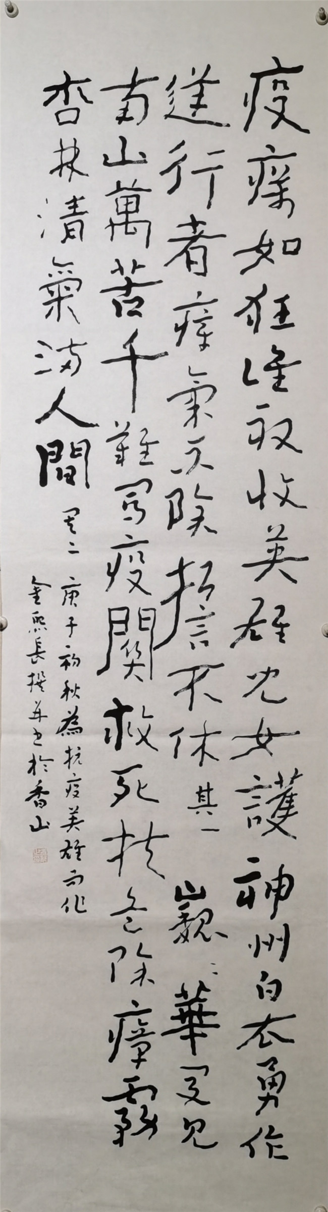 “筆筆有出處,字字有來歷。每個字用筆中鋒但結(jié)字奇古;書風(fēng)野逸但又視覺大氣。正如創(chuàng)作者所言:中國是歷史悠久的文化大國,所以中國的文字書寫應(yīng)該和大國文化相吻合的,以雄渾大氣為主要審美意識的表現(xiàn)手法方能展現(xiàn)中國精神。在技法上他還認(rèn)為,秀媚易作雄渾難;小巧易作高簡難。故在本次《金體》創(chuàng)作上的審美觀念上,他仍以三個第一為導(dǎo)向,即“結(jié)體以正大老成為第一,用筆以簡重真切為第一,書風(fēng)以高古偉岸為第一。