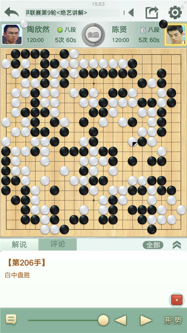 慢棋第一臺由深圳宏發(fā)隊的陶欣然八段執(zhí)白對陣江蘇隊的陳賢八段。雙方開局下出一個復(fù)雜的大型變化,局面一度兩分。序盤結(jié)束時陶欣然下出一步緩手,使得勝負(fù)的天秤向黑方傾斜。弈至官子階段,黑方下出了大意的敗招,單官沖斷白兩塊活棋,相當(dāng)于自停一手,使得白棋追回不少目數(shù)。之后黑棋如繼續(xù)收官局面仍然細(xì)微,但陳賢在出現(xiàn)失誤后心態(tài)失衡,孤注一擲殺白大龍,最終失敗,白棋幸運(yùn)獲勝。