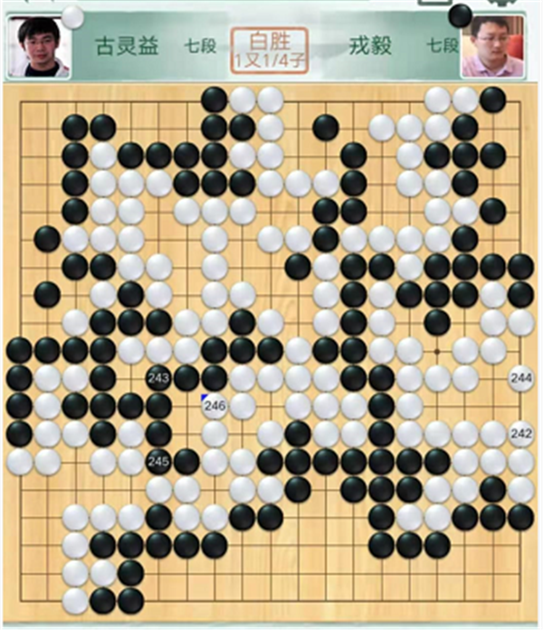 第三臺快棋,深圳隊的戎毅七段執(zhí)黑對陣成都隊的古靈益七段。黑棋開局采取取地策略。下方黑棋形狀處理保守,子效重復(fù)虧損。之后黑棋一直沒有明顯勝機,最終以1又1/4子落敗。戎毅執(zhí)黑1又1/4子負(fù)古靈益。