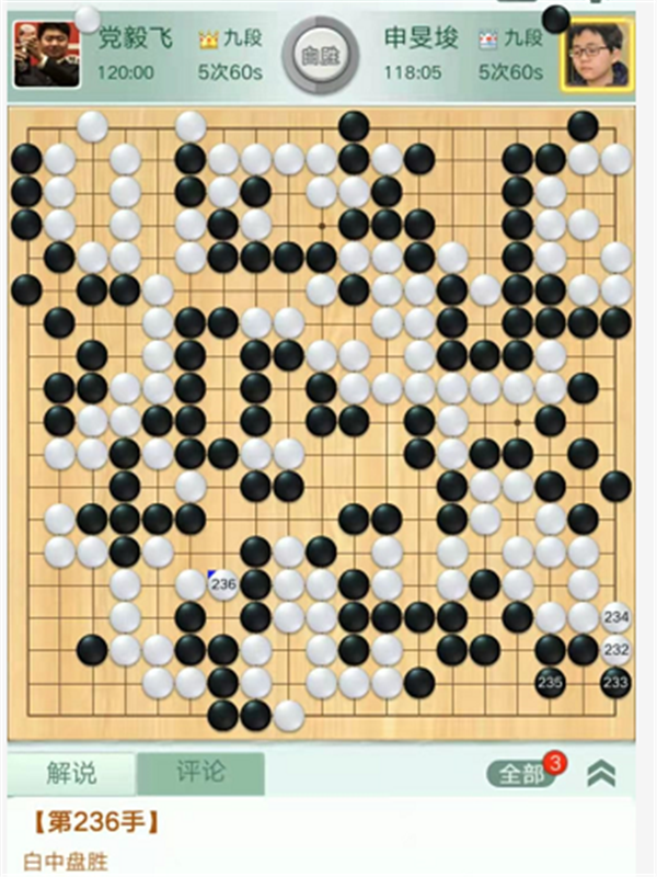 第一臺慢棋,由深圳隊的外援申旻埈九段執(zhí)黑對陣成都隊的世界冠軍黨毅飛九段。右下角白棋出現(xiàn)失誤,黑棋沒有抓住機會反而被白棋便宜不少。之后黑棋頑強追趕局面一度接近。但是官子階段黑棋始終沒有發(fā)現(xiàn)左上角官子便宜的小巧手,被白消除隱患后,白勝勢。申旻埈執(zhí)黑中盤負(fù)黨毅飛。