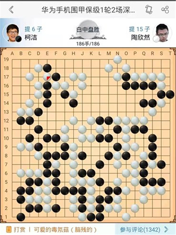 主將臺由深圳隊陶欣然八段執(zhí)白對陣民生隊的柯潔九段。開局右下角黑棋行棋次序錯誤,遭到白棋反擊。黑棋沖動的選擇打劫轉換,轉換后白棋已經(jīng)勝勢。之后黑棋左邊頑強制造打劫,再次形成轉換依然局面大差。之后黑棋又在上邊挑起劫爭,白棋劫材很多,黑認負,陶欣然中盤勝柯潔。陶欣然達成對世界第一人的三連勝。