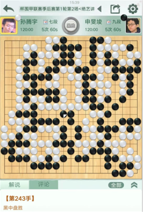慢棋第三臺由深圳隊的外援申旻埈九段執(zhí)黑對陣民生隊的孫騰宇七段。中盤白棋上方和中央聯(lián)系失誤,黑棋領先。黑棋對中央白棋大龍和左下白棋大龍展開纏繞攻擊,最后穩(wěn)健的讓白棋做活進入官子。最終黑棋以3/4子的最小差距獲勝,申旻埈3/4子勝孫騰宇。