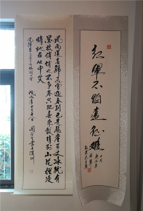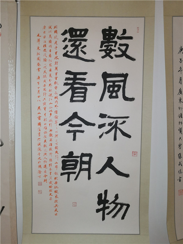 活動開始前,與會嘉賓在服務(wù)人員的引導(dǎo)下參觀了《毛澤東詩詞主題書法展》。展廳布置的作品有40余幅,全部內(nèi)容均為毛澤東同志在革命活動所創(chuàng)作的詩詞,或整篇書寫,或取其意。作品形式以橫幅、斗方、條幅、對聯(lián)為主,字體多為行草,間有楷書隸書,書寫者有企事單位的領(lǐng)導(dǎo)、干部和離退休人員。在這個特殊的日子里,他們以此形式緬懷毛主席的豐功偉績,表達內(nèi)心對毛澤東同志的敬意和懷念。