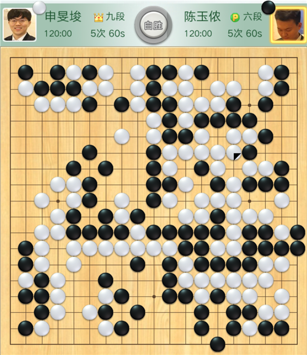 本輪比賽,率先破局取勝的是二臺(tái)外援主將申旻埈。是局,申旻俊執(zhí)白對(duì)陣三連勝的小將陳玉儂。黑棋開(kāi)局沖擊右下白棋急躁,白棋處理好后局面大幅領(lǐng)先。黑棋之后在左邊與上邊奮力拼搏,白棋冷靜應(yīng)對(duì),輕松獲勝。行棋204手。