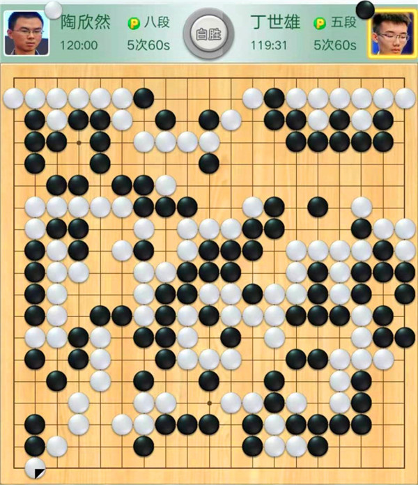 最后一局隨即揭曉:陶欣然“錦上添花”,執(zhí)白完勝丁世雄。布局時(shí),白棋左邊與右上獲利。黑棋進(jìn)攻右邊白棋時(shí)候,白棋漂亮棄子搶占左下大棋優(yōu)勢(shì)擴(kuò)大。之后白棋穩(wěn)扎穩(wěn)打直至終局獲勝。