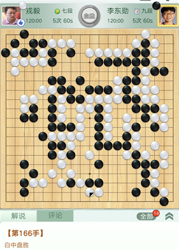 龍華隊(duì)戎毅七段本輪重新披掛上陣,執(zhí)白對(duì)陣韓國(guó)排名第四的李東勛。開(kāi)局二十幾手時(shí),黑在左上出現(xiàn)重大失誤,白棋大幅領(lǐng)先。之后,白思路清晰,掌控局面,優(yōu)勢(shì)逐漸擴(kuò)大,而速勝。