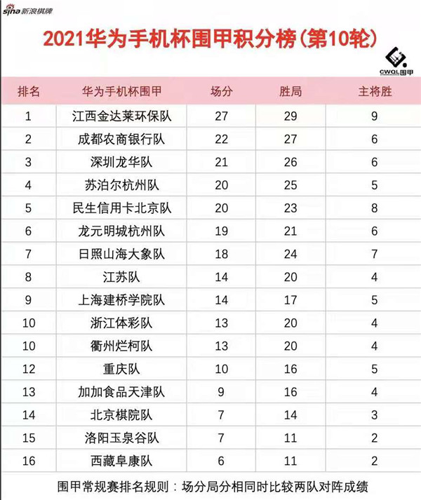 讀特客戶端?深圳新聞網(wǎng)2021年6月12日訊(記者周錦春)華為手機(jī)杯男子圍甲聯(lián)賽第二階最后一輪比賽今日塵埃落定,16圍甲隊(duì)伍可以暫時(shí)偃旗息鼓,安安心心地享受端午節(jié)的快樂(lè)時(shí)光了。第十輪深圳龍華隊(duì)對(duì)陣龍?jiān)鞒呛贾蓐?duì),以1:3再次敗退一步,從積分榜第二的位置降至第三,江西隊(duì)金達(dá)萊環(huán)保隊(duì)、成都農(nóng)商銀行隊(duì)分居狀元、榜眼之位。圍甲第三階段比賽預(yù)計(jì)在8月底繼續(xù)在浙江長(zhǎng)興進(jìn)行。