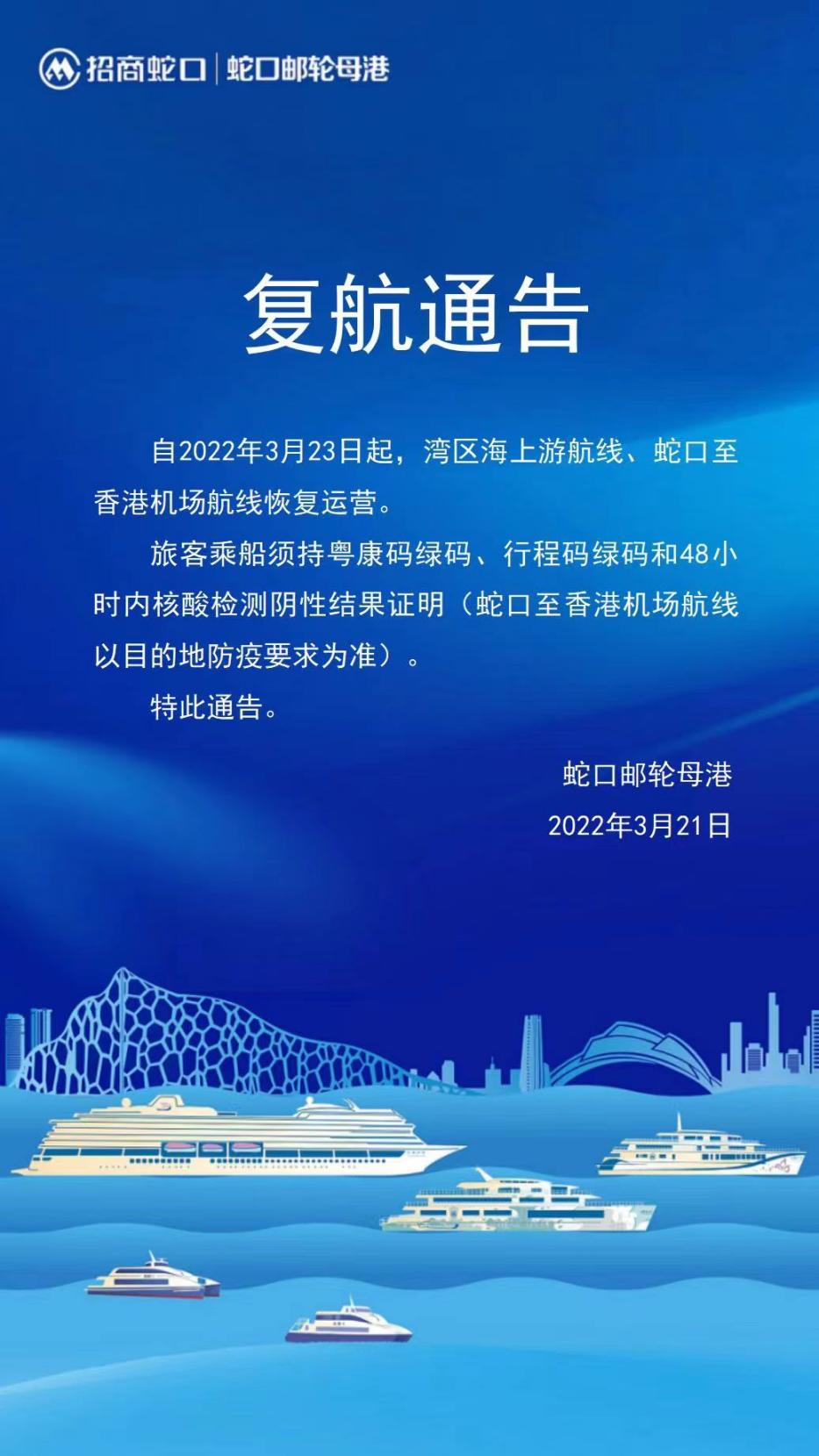 讀特客戶端·深圳新聞網(wǎng)2022年3月21日訊(記者 田志強(qiáng))記者從招商蛇口郵輪母港獲悉,自3月23日起,灣區(qū)海上游航線、蛇口至香港機(jī)場(chǎng)航線恢復(fù)運(yùn)營(yíng)。旅客須持粵康碼綠碼、行程碼綠碼和48小時(shí)內(nèi)核酸檢測(cè)陰性結(jié)果證明乘船。