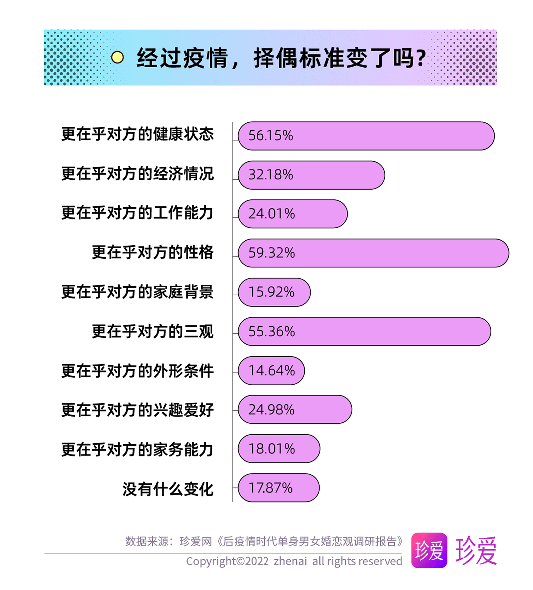 人們的生活方式和心態(tài)因疫情影響有或多或少的改變,而單身青年們的擇偶標準也在發(fā)生著變化,調(diào)查顯示,經(jīng)歷過疫情,單身青年們更在乎的擇偶條件包括對方的性格(59.32%)、健康狀態(tài)(56.15%)和三觀(55.36%),對方的經(jīng)濟情況、興趣愛好、工作能力以及家務能力也是考量的重要標準。
