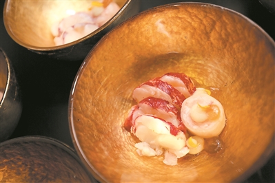 頭盤 “荷塘魚趣”,主角黃花魚來自世界第三大江——長江。步步生蓮是東方禪意,蓮子依依是情誼,蓮藕結結是路路通達,Alvin Leung此次演繹的中式料理充滿東方元素,表達的是和諧交融。主菜“日式鮮味香烤和?!笔侨毡局鲝NHisamitsu Hataji 之作,他用創(chuàng)新手法融入經(jīng)典的日式料理中,表達一年四季食材與味道的關系,這是關于美食的光陰的故事。甜品出自Clement之手,是晚宴甜蜜的句號。