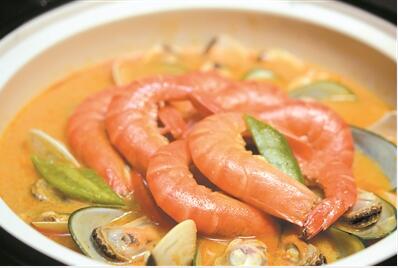 在東莞某國(guó)際大酒店,掌勺主廚將新鮮九節(jié)蝦去掉蝦腸洗凈,土豆切丁入油鍋香炸備用。熱鍋中放蔥蒜粒、洋蔥片和青紅椒片炒香,加入適量用雞肉與排骨熬就的高湯,倒入咖喱粉煮滾。依序滑入白貝、青口和九節(jié)蝦水燜煮去腥,待九成熟時(shí)分別撈起,以盡量保持海鮮的鮮嫩度。砂鍋底部平鋪一層炸好的土豆,分層碼上貝類、青口等海鮮,再淋透上熬好的香濃咖喱汁,海鮮鍋即大功告成。入口酸酸辣辣十分刺激開(kāi)胃,輕而易舉激活味蕾。
