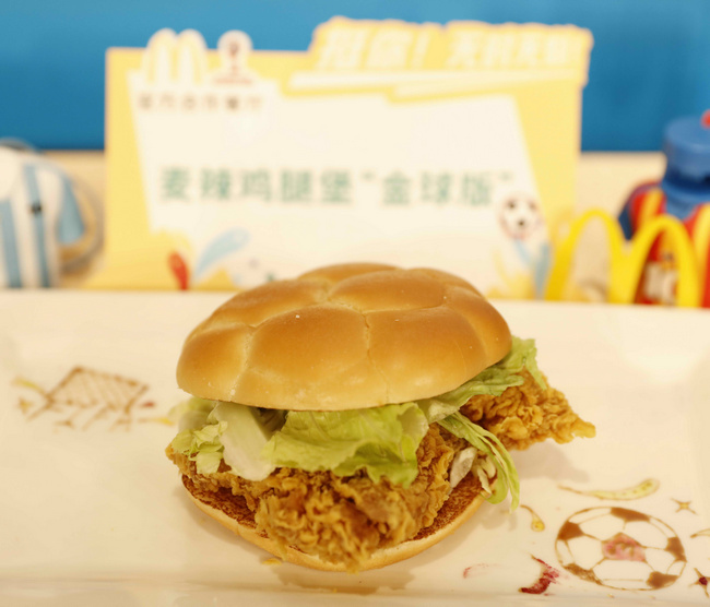 麥當(dāng)勞中國最受歡迎的漢堡單品——麥辣雞腿漢堡,在FIFA世界杯期間搖身一變“金球版”,蓋上足球形狀堡頂,F(xiàn)IFA世界杯期間10元限時(shí)特價(jià)