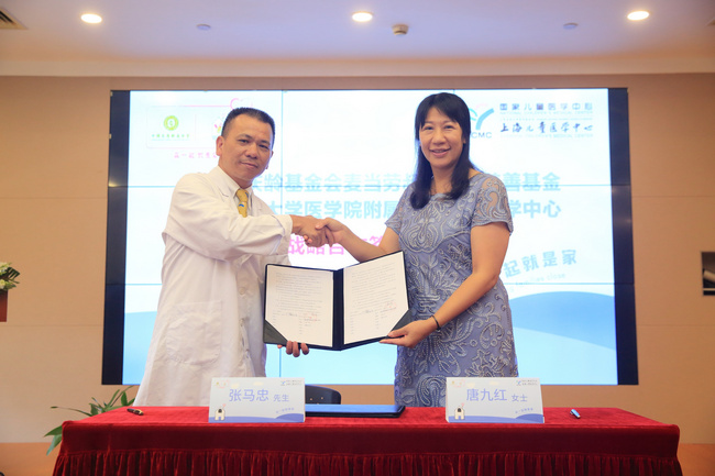 中國(guó)宋慶齡基金會(huì)唐九紅部長(zhǎng)(右),國(guó)家兒童醫(yī)學(xué)中心(上海兒童醫(yī)學(xué)中心)張馬忠副院長(zhǎng)(左)簽署雙方戰(zhàn)略合作協(xié)議