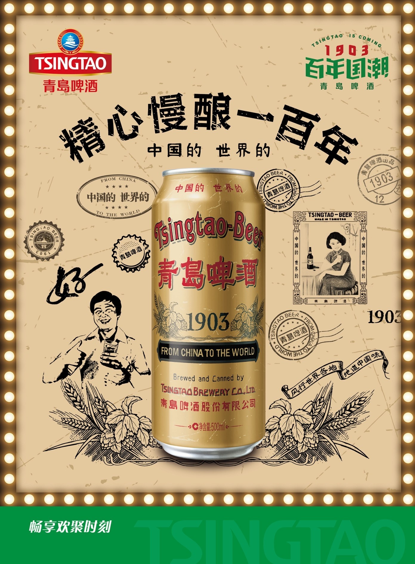 經(jīng)典1903國潮罐是青島啤酒“向經(jīng)典致敬,再造精釀傳奇”理念下推出致敬經(jīng)典的力作,采用青島啤酒1903年“兩段法低溫長時間慢熟”獨特且傳統(tǒng)的釀造工藝,始終堅持工匠精神,從原料篩選到工藝釀造的每一個環(huán)節(jié),都像雕琢藝術(shù)品一樣精致打磨,精心慢釀,造就了麥香濃郁醇香四溢的口感和體驗,其罐體復(fù)刻了百年前經(jīng)典瓶貼畫面的匠心細節(jié),復(fù)古元素與國際時尚潮流融于一體,是復(fù)古和時尚的典范。