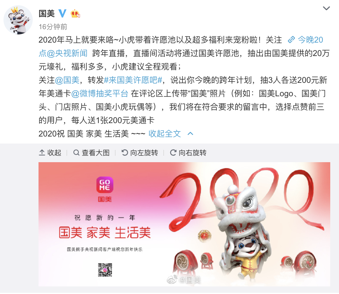 跨年就是要大聲說(shuō)出你的心愿,趕快@國(guó)美幫你圓夢(mèng)?;顒?dòng)當(dāng)天,國(guó)美官方微博將與央視新聞同步抽獎(jiǎng),2019年12月31日17點(diǎn)起至2020年1月1日不同時(shí)間段抽取多項(xiàng)大獎(jiǎng),其中最高獎(jiǎng)項(xiàng)為價(jià)值2020元國(guó)美美通卡1張。