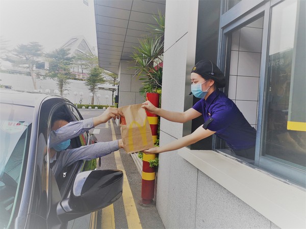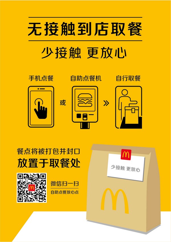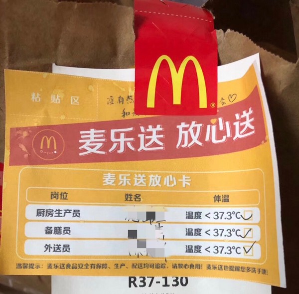 為了讓顧客放心,麥當(dāng)勞在安全服務(wù)的前提下,餐廳實(shí)施“無接觸配送”和“無接觸到店取餐”。所有外送訂單均附上“麥樂送放心卡”,標(biāo)注生產(chǎn)、配膳、外送人員姓名及體溫,做到餐品、人員可追蹤。顧客可選擇讓外送員將餐品送到指定位置取餐,在手機(jī)、餐廳自助點(diǎn)餐機(jī)或柜臺點(diǎn)餐后,無論堂食或外帶,員工都會將制作好的餐點(diǎn)裝入打包袋并封口,放置到取餐處。