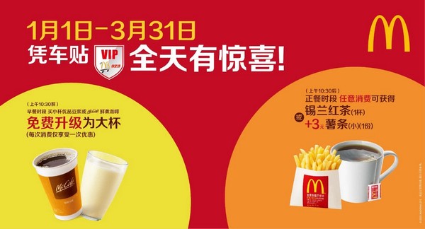 開車取餐少接觸,麥當(dāng)勞“得來速”餐廳讓駕車的顧客購餐更方便、安全且快速。駕車者不用下車,在餐廳車道的窗口即可完成點(diǎn)餐、付款和取餐?,F(xiàn)在免費(fèi)領(lǐng)取 VIP車貼享福利,3月31日前,早餐時(shí)段購買小杯優(yōu)品豆?jié){或鮮煮咖啡可免費(fèi)升杯;正餐時(shí)段任意消費(fèi)即贈錫蘭紅茶,或者加3元換一份小薯?xiàng)l。(常軍平)