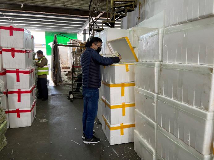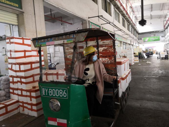 市場的檔主、物流車司機、加工工人,全部都帶上口罩,看新聞講跟人講話要保持距離,但忙起來真顧不了那么多,大家都在“搶貨”,這頭跟檔主商量好,那頭貨可能被拉走了?!柏浺阶约旱募庸ぶ行模潘闶悄愕?。”因為春節(jié)批發(fā)市場的檔口工人回去一大半了,沒人送貨,緊張的時候,有女同事干脆自己借一輛三輪車,把談好的貨源直接拉走。