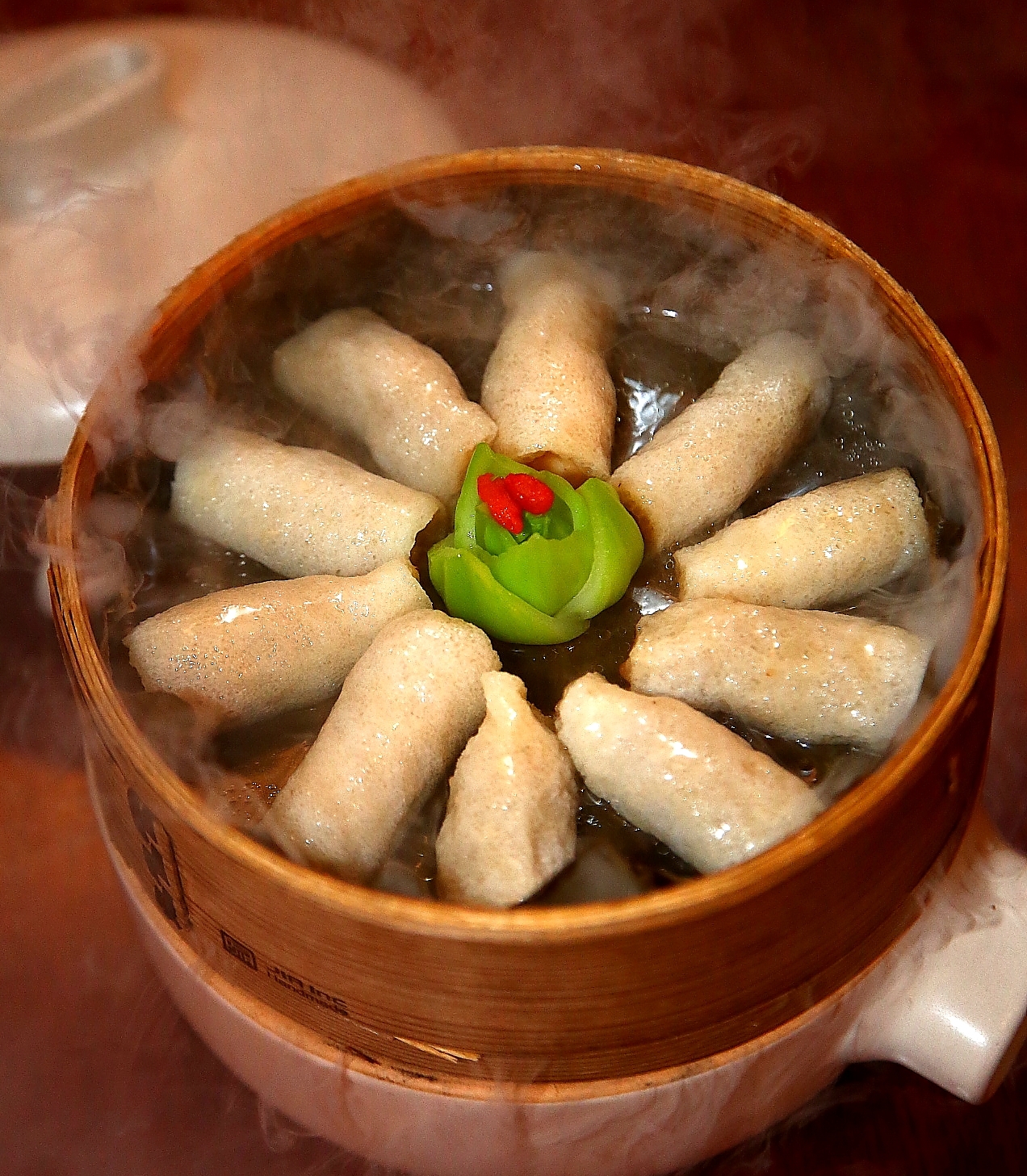 這款也是蒸雞,不過是將蒸雞起骨拆肉釀入竹笙中,比較復(fù)雜