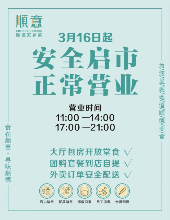 近日,記者發(fā)現(xiàn),深圳人喜愛的順德菜之一順意順德家鄉(xiāng)菜深圳3家門店福華一路店、車公廟店、科技生態(tài)園店已于3月16日全面恢復(fù)正常營業(yè),同時(shí),大廳包房均可開放堂食,外賣服務(wù)同樣進(jìn)行中,不方便到店消費(fèi)的也可以叫外賣。