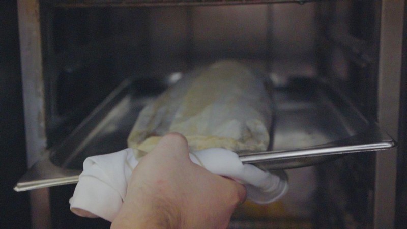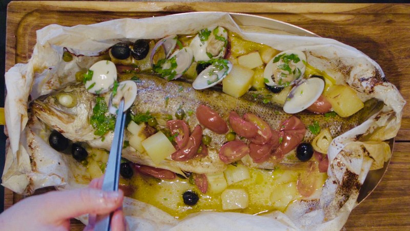 清蒸鱸魚是常見的粵式吃法,本期,四季酒店主廚畢柏克為吃貨們帶來別樣的鱸魚吃法——“烤紙包鱸魚”。他將魚進(jìn)行腌制后,用烘焙用紙裹緊,在烤爐中烤制40分鐘。吸收了海鮮文蛤、白葡萄酒精華的魚肉緊實(shí)鮮嫩,在打開外包紙的那一刻,香氣四溢,讓人欲罷不能。如此烹法,也能最大限度保存魚的營養(yǎng)和鮮美。