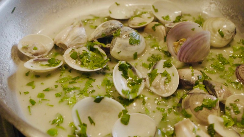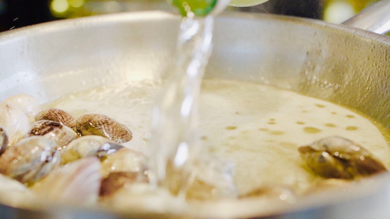 6、在平底鍋中加入適量橄欖油,一邊翻炒大蒜瓣和文蛤,一邊加入白葡萄酒。待文蛤開殼后,加入檸檬汁以及歐芹,繼續(xù)烹煮。待熟后,撈起備用;