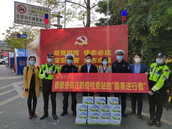 在深圳,2020年2月伊利攜手深圳市關(guān)愛辦及深圳新聞網(wǎng)發(fā)起“致敬‘最美逆行者’”活動(dòng),向深圳戰(zhàn)疫一線的民警、交警、醫(yī)務(wù)工作者、義工等進(jìn)行慰問和捐贈,先后前往光明區(qū)光明交警大隊(duì)、光明羌下公安檢查站、寶安區(qū)松安防疫檢查點(diǎn),為戰(zhàn)疫在一線的工作人員送上愛心牛奶與溫暖午餐。
