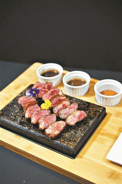 4.準備一塊燒熱的石板,將牛肉厚片放于其上,配上黑椒汁、黑松露汁和牛排調料即可(圖⑥)。