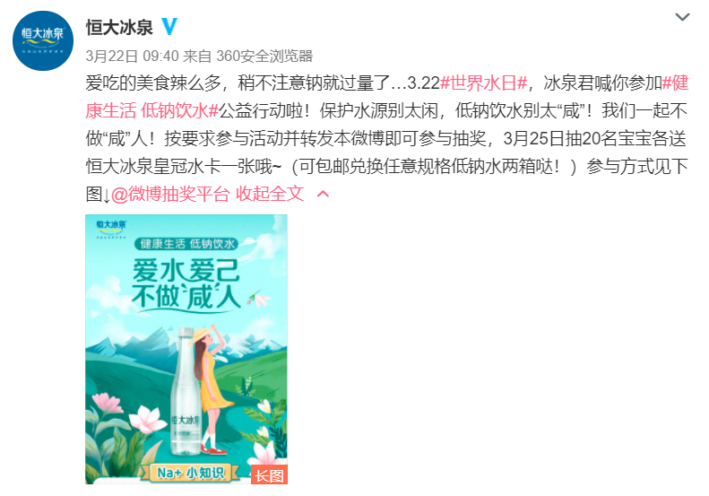 見圳客戶端·深圳新聞網(wǎng)2021年3月30日訊 (記者 常軍平)目前正值3月22日第二十九屆“世界水日”以及3月22—28日第三十四屆“中國水周”之際,恒大冰泉天然低鈉礦泉水深入洞察借勢,發(fā)起以不做“咸”人為主題的公益活動(dòng),引發(fā)了全網(wǎng)的關(guān)注熱議和積極參與,刷屏社交媒體,成為新的公益“爆款”。