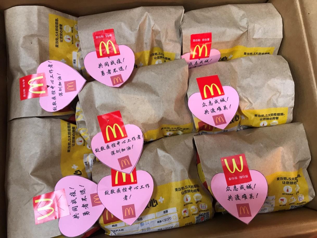 深圳麥當(dāng)勞“麥麥義工團(tuán)”小伙伴們向龍崗疾控中心防疫工作一線的醫(yī)護(hù)人員贈送愛心餐食