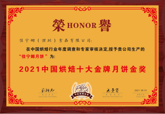 經(jīng)過(guò)多年的發(fā)展與沉淀,佳寧娜月餅以先進(jìn)的工藝、獨(dú)特的口味、卓越的信譽(yù)贏得消費(fèi)者的信賴和支持,曾榮獲“深圳老字號(hào)”“深圳月餅節(jié)質(zhì)量信譽(yù)獎(jiǎng)” (連續(xù)12年 )“中國(guó)食品安全年會(huì)食品安全示范單位”“中國(guó)烘焙五仁月餅金獎(jiǎng)”“中國(guó)烘焙廣式月餅金獎(jiǎng)”“中國(guó)烘焙潮式月餅金獎(jiǎng)”、“中國(guó)烘焙十佳名牌月餅”、“中國(guó)烘焙老字號(hào)月餅“等多項(xiàng)榮譽(yù)稱(chēng)號(hào)。