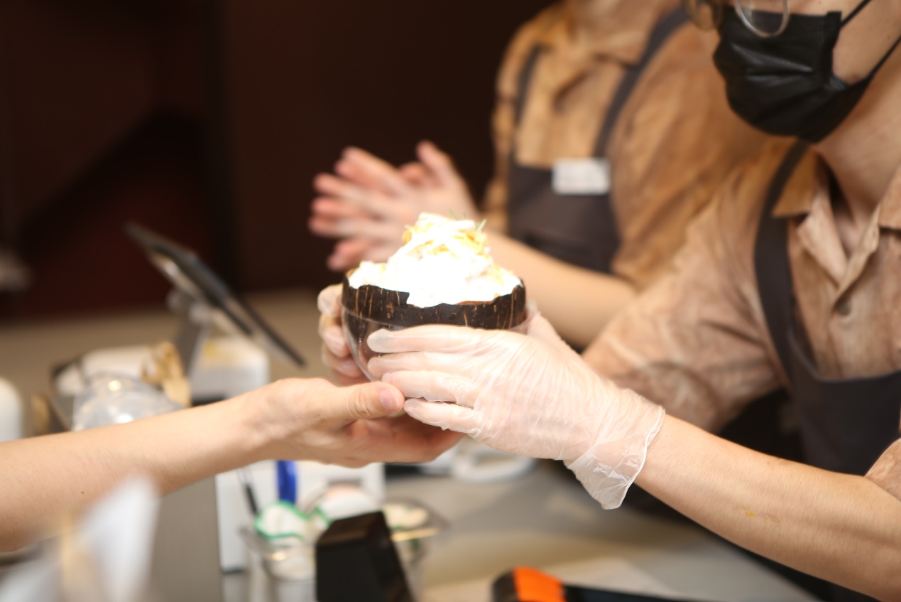 一次性提供如此豐富的手造新品,既是喜茶產(chǎn)品研發(fā)能力的集中體現(xiàn),又是為顧客奉上的極致體驗。記者在現(xiàn)場看到,10點正式營業(yè)后,在一樓點單區(qū),店員們開始耐心地向顧客進行新品介紹和推薦。一些顧客則留意到正在進行的現(xiàn)場炒冰,“剛剛做的那份是什么?我就要那個!”而二層供應的“實在整顆生椰”,也讓不少顧客愛不釋手。