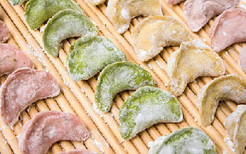 菠菜榨汁與面粉均勻拌成面團(tuán)醒發(fā)十分鐘;肉末加上蝦仁丁、香菇粒、胡蘿卜粒、鹽、雞精、糖拌勻,即可包百菜餃。
