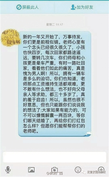 爆料帖中同時上傳了多張聊天記錄,其中一張顯示:“新的一年又開始了,萬事待發(fā),你們更是前程似錦。老師心里有個念頭已經(jīng)很久了,小孩也快四歲了,每次回家都路途遙遠,要轉幾次車,你們師母和小孩更是暈車嚴重,有時一路吐回家,看看他們?nèi)绱送纯?,真是愧為男人啊!所以,擁有一輛車是多么的迫切。你們也知道老師那些工資維持生活都很艱難,更不敢有什么想法,也不好向父母親人求助,都三十多歲了,真的羞于啟齒!所以,雖然也很不好意思,但是也只能跟你們說說我的想法了:大家如果有能力的,可不可以慷慨解囊一兩百塊,等你們哪天結婚了,再給你們打紅包怎么樣?但愿你們能幫幫你們的老師吧?!?/p>
