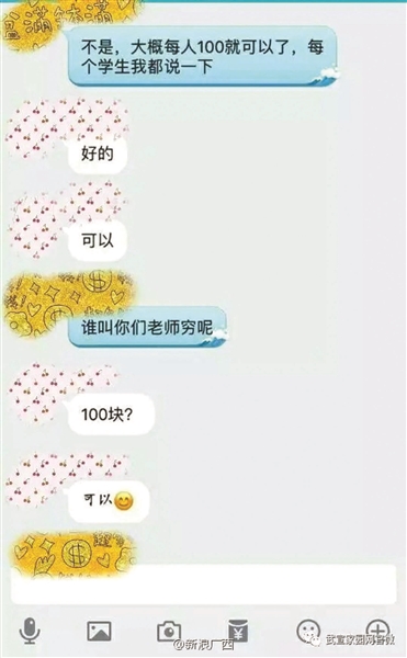 在被曝光的聊天記錄中,該老師曾表示,“大概每人100就可以了,每個學生我都說一下。”并解釋說,“誰叫你們老師窮呢?”聊天記錄顯示,群內(nèi)多名學生回復稱,“可以?!?/p>