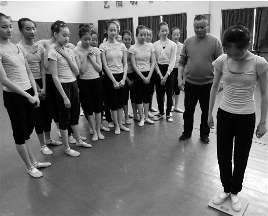 班長杜婉琳說,其實(shí)稱體重是舞蹈系的慣例,不僅開學(xué)會稱,每個(gè)月,甚至每周老師都會抽查體重?!扒啻浩诘呐⑹侨菀着?,一般讓她們多吃魚,營養(yǎng)能保證,也不容易胖。”昨天負(fù)責(zé)上課的王老師說。