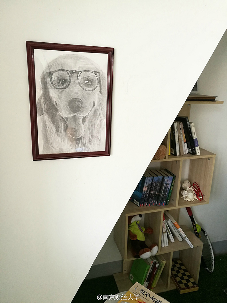 墻上一幅戴著眼鏡的小狗素描圖格外引人注目,它是由602舍長(zhǎng)涂貴平親手畫的?!斑@幅畫還是去年自己參加了一個(gè)帶有公益性質(zhì)的畫畫班學(xué)的,我也沒想到能畫成這樣?!眮?lái)自貴州的涂貴平害羞地說(shuō),其實(shí)裝飾寢室的初衷很簡(jiǎn)單,錢就花了300塊不到,主要是希望大學(xué)四年能住在干凈的環(huán)境。