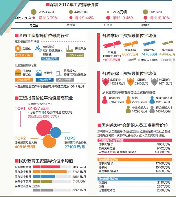 深圳哪些行業(yè)最有“錢途”?哪個職業(yè)最吸金?9月18日,由深圳市人社局發(fā)布的《2017年深圳市人力資源市場工資指導價位》顯示,2017年,深圳工資指導價位平均值為5611元/月,比去年上漲10.10%。在508個職業(yè)中,證券發(fā)行專業(yè)人員依然最吸金,工資指導價位平均值為61437元/月。此外,深圳今年還首次發(fā)布社會組織從業(yè)人員工資指導價位。
