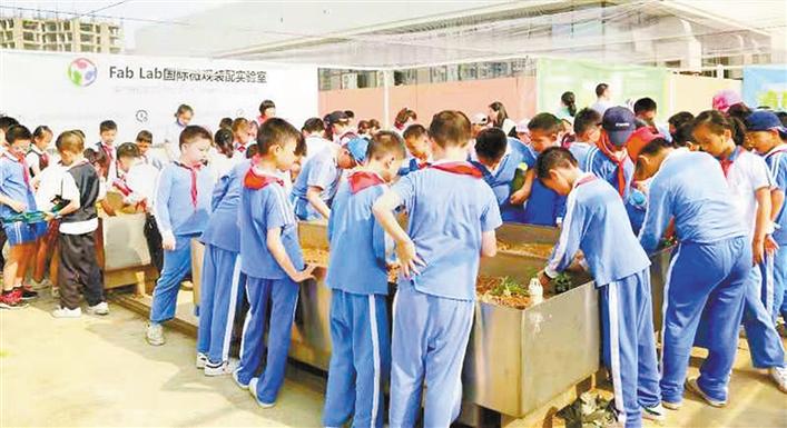 8年來,隨著生態(tài)體驗校本課程不斷升級改造,教學(xué)樓中庭不僅有水稻田,還開發(fā)了蔬果園、野果園、生態(tài)池等體驗空間。每個樓層的走廊上種上了百香果、金銀花等植物,教學(xué)樓的樓頂上也被開發(fā)利用,所種植瓜果蔬菜、花木、中草藥等植物品類達(dá)100多種,建成了一片面積達(dá)8000平方米的學(xué)生體驗式實踐基地,這為孩子們提供了得天獨(dú)厚的體驗學(xué)習(xí)空間,使他們能夠親歷種植過程,認(rèn)知生命的成長規(guī)律,也使得基地四季都能夠服務(wù)于教育教學(xué)。