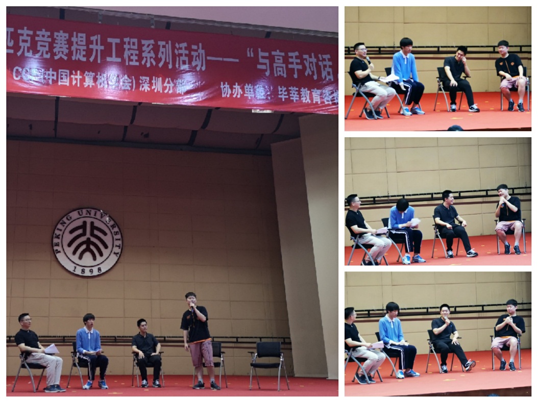 本次活動(dòng)除了邀請(qǐng)周楷文同學(xué)親臨現(xiàn)場(chǎng)之外,還邀請(qǐng)了雅禮中學(xué)正高級(jí)教師,為雅禮貢獻(xiàn)了9塊IOI金牌的朱全民老師;北京大學(xué)深圳研究生院計(jì)算機(jī)專業(yè)雷凱副教授;雅禮中學(xué)畢業(yè),通過(guò)信息學(xué)競(jìng)賽保送到北京大學(xué)信息科學(xué)與技術(shù)學(xué)院計(jì)算機(jī)專業(yè)就讀本科以及研究生的章嘉晨同學(xué),國(guó)際大學(xué)生信息學(xué)競(jìng)賽(ICPC)區(qū)域賽金獎(jiǎng)、報(bào)送北京大學(xué)深圳研究生院就讀計(jì)算機(jī)專業(yè)的陳銳彪同學(xué)。