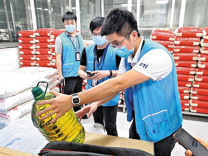 工作人員在學(xué)校食堂倉庫進(jìn)行食品原材料抽檢。