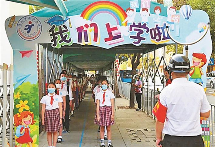 健康副校長和指導(dǎo)員在新沙小學(xué)指導(dǎo)防疫工作,引導(dǎo)學(xué)生有序入校。