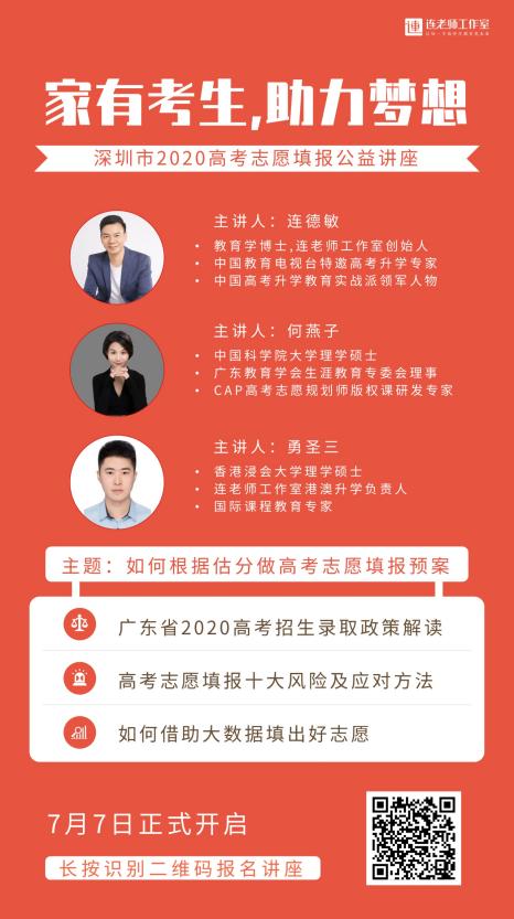 據(jù)悉,連老師工作室深圳市2020高考志愿填報公益講座接下來還會連續(xù)舉辦四場線下公益講座,講座均由連德敏博士主講,以“如何根據(jù)分數(shù)做高考志愿填報預案”為主題,解讀廣東省2020高考招生錄取政策,分享高考志愿填報十大風險及應對方法以及如何借助大數(shù)據(jù)填出好志愿等精彩內(nèi)容,幫助廣東省考生和家長更好的完成志愿填報。