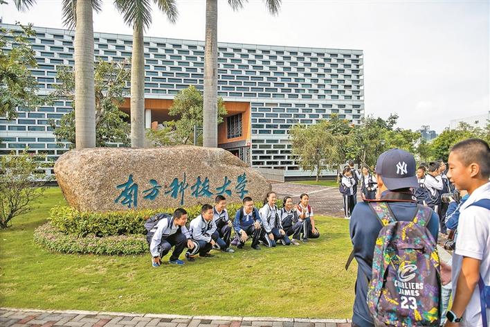 對(duì)南科大懷有興趣的中學(xué)生在校名石前合影。