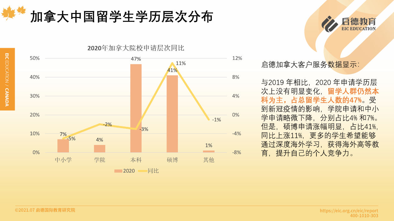 加拿大移民局?jǐn)?shù)據(jù)顯示,2020年入學(xué)的中國內(nèi)地學(xué)生中,大學(xué)(本、碩、博)階段占比為23.4%,學(xué)院占比7.4%,中小學(xué)占比55%。啟德留學(xué)客戶服務(wù)數(shù)據(jù)顯示,2020年通過啟德申請(qǐng)加拿大留學(xué)的學(xué)生中,本科與碩博的學(xué)生占比分別為47%與41%,學(xué)院和中小學(xué)分別占比4%與7%。