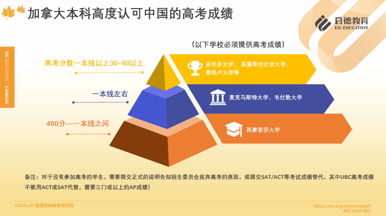 加拿大本科認(rèn)可中國的高考成績(jī),其中多倫多大學(xué)、英屬哥倫比亞大學(xué)、滑鐵盧大學(xué)等要求高考分?jǐn)?shù)一本線30-40分以上,麥克馬斯特大學(xué)、韋仕敦大學(xué)要求一本線左右,西蒙菲莎大學(xué)要求490分至一本線之間。沒有參加高考的學(xué)生,需要提交正式的說明告知招生委員會(huì)放棄高考的原因,或提交SAT/ACT等考試成績(jī)替代(其中英屬哥倫比亞大學(xué)高考成績(jī)不能用ACT或SAT代替,需要三門或以上的AP成績(jī))。