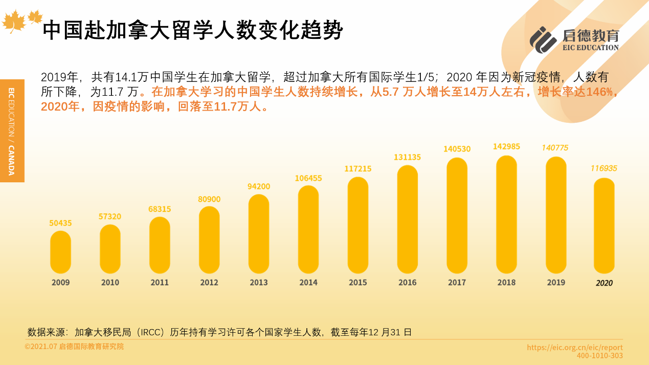 據(jù)加拿大移民局(IRCC)公布的數(shù)據(jù)顯示,2020年加拿大留學(xué)生來源國家排在前10位分別是:印度、中國、法國、美國、越南、尼日利亞、韓國、伊朗、巴西、孟加拉國。從2010年到2020年的11年間,在加拿大學(xué)習(xí)的中國學(xué)生人數(shù)持續(xù)增長(zhǎng),從5.7萬人增長(zhǎng)至14萬人左右,增長(zhǎng)率達(dá)146 %,2020年,因疫情的影響,回落至11.7萬人。