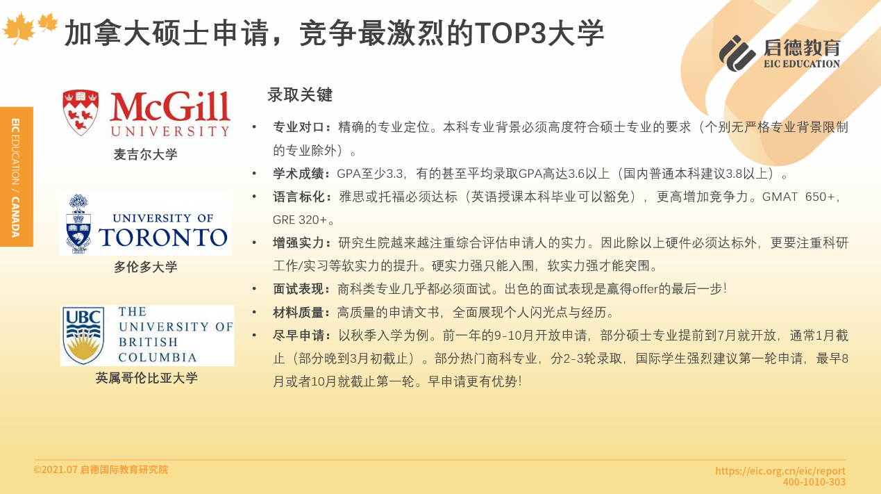 據(jù)啟德留學(xué)加拿大項(xiàng)目介紹,加拿大碩士申請(qǐng)競(jìng)爭(zhēng)最激烈的三所大學(xué)為麥吉爾大學(xué)、多倫多大學(xué)與英屬哥倫比亞大學(xué)。申請(qǐng)人 GPA至少達(dá)到3.3,有的甚至要求平均錄取 GPA高達(dá)3.6以上(國內(nèi)普通本科建議3.8以上);雅思或托福必須達(dá)標(biāo)(英語授課本科專業(yè)可以豁免), GMAT650+, GRE320+;除硬件必須達(dá)標(biāo)外,加拿大名校注重科研、工作 /實(shí)習(xí)等軟實(shí)力的提升;商科類專業(yè)幾乎都必須面試。