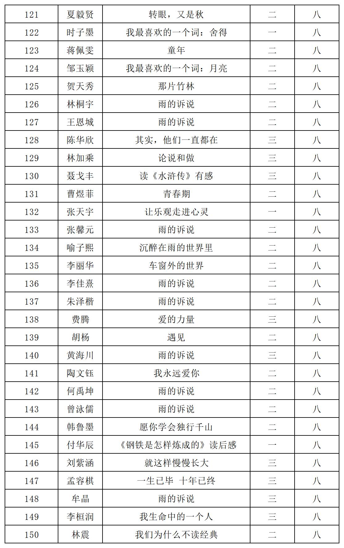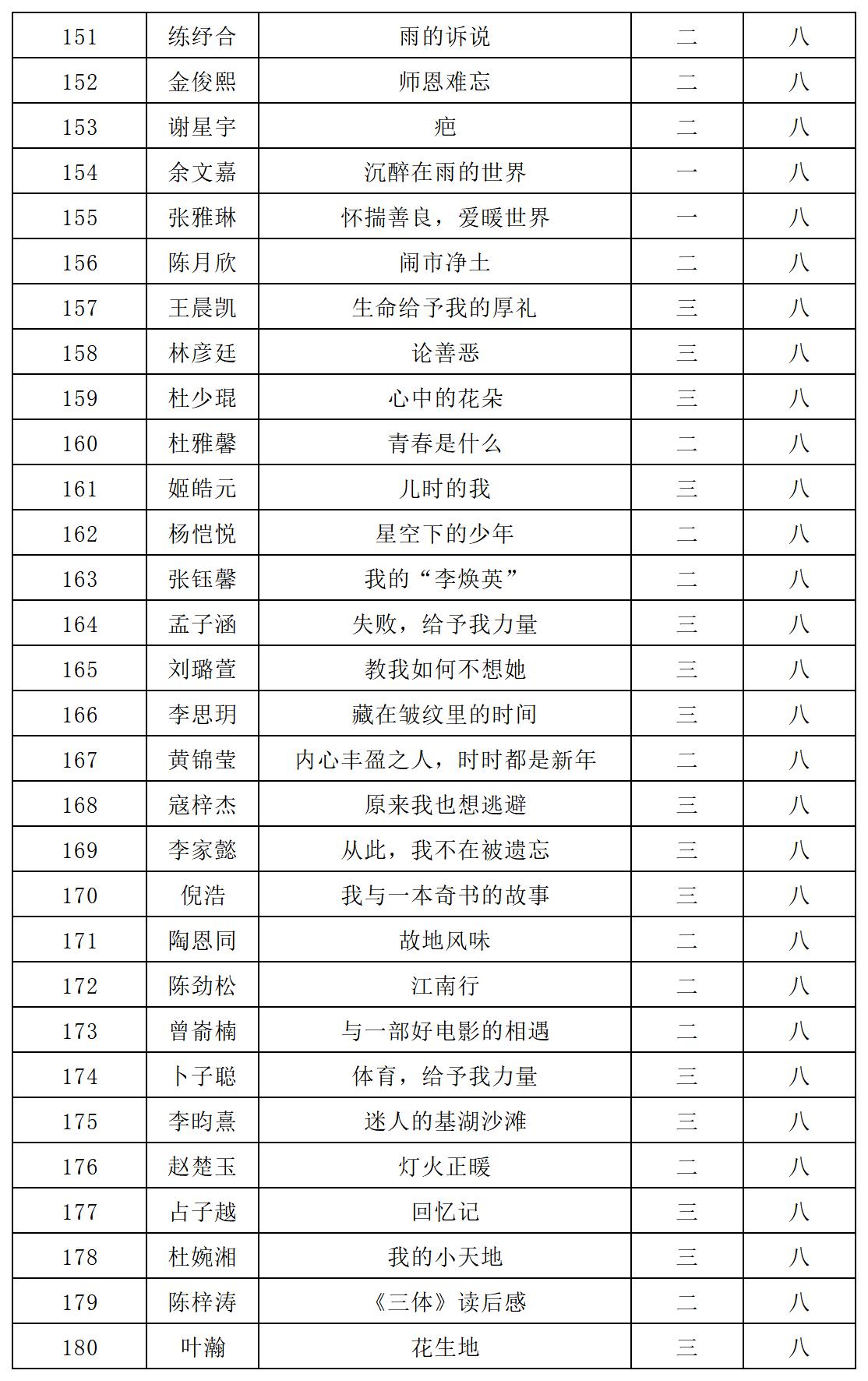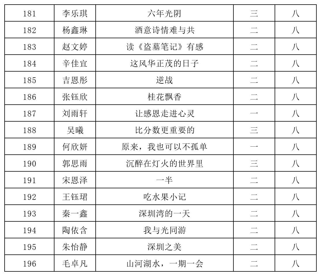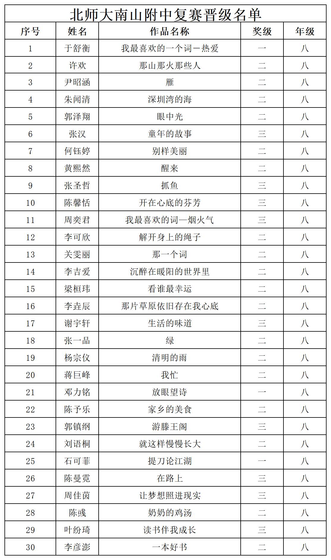自2021年1月,活動(dòng)征稿啟動(dòng)以來,獲得了深圳市廣大中小學(xué)生、教師、文學(xué)愛好者的熱烈響應(yīng)積極參與,吸引了深圳百余所學(xué)校的上萬人關(guān)注報(bào)名?,F(xiàn)公布北師大南山附屬學(xué)校中學(xué)部晉級(jí)復(fù)賽名單如下: