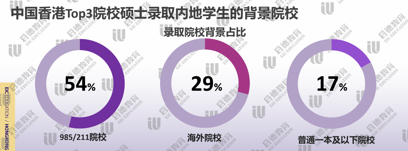 申請香港高校提交雅思成績較多,啟德留學2021客戶服務數(shù)據(jù)顯示,近3成錄取學生雅思成績達到7分或以上,主要集中在金融、會計、傳媒、英語教育等熱門專業(yè);雅思達到6.5分占比幾乎一半,代表了香港高校錄取學生的平均水平;雅思6分占比不到四分之一,主要分布于理工科或冷門專業(yè)。香港TOP3名校(香港大學、香港科技大學、香港中文大學)錄取的碩士學生中,985/211院校背景的學生超過了一半;因疫情因素導致海外留學生的回流,近30%的碩士學生來自于海外院校本科;雙非院校的占比僅為17%,集中于需要豐富實習和工作經(jīng)驗的理工科。擁有實習/科研等經(jīng)歷占比為99%,其中,超八成學生完成了3次以上的實習/科研。